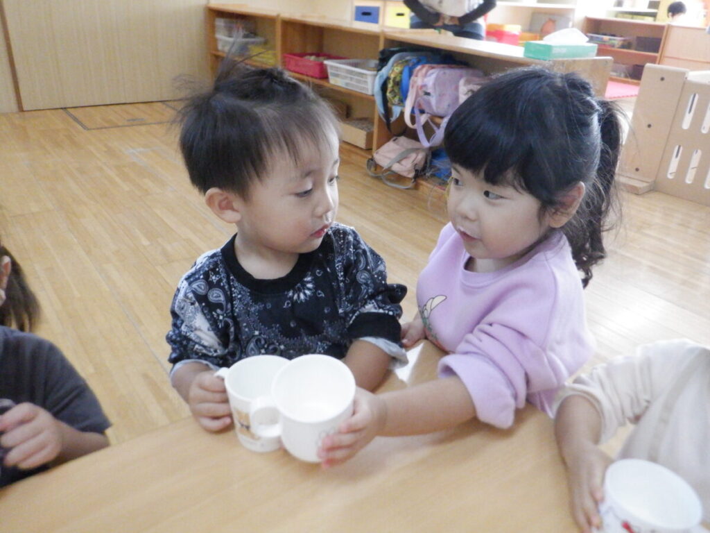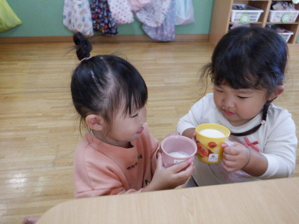 「かんぱーい」とお友だちと仲よくゴクゴク