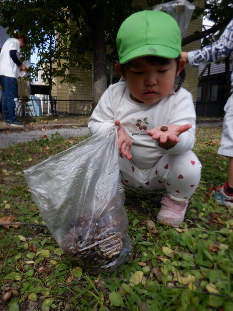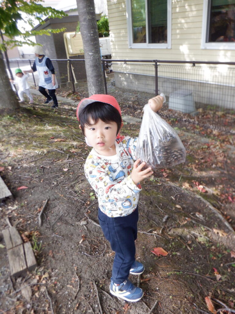 たくさん袋に集めた松ぼっくり。お母さん、お父さんに見せるんだとルンルンで