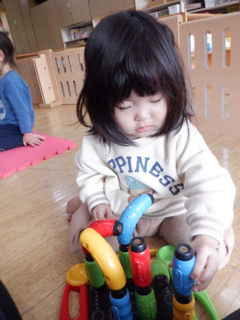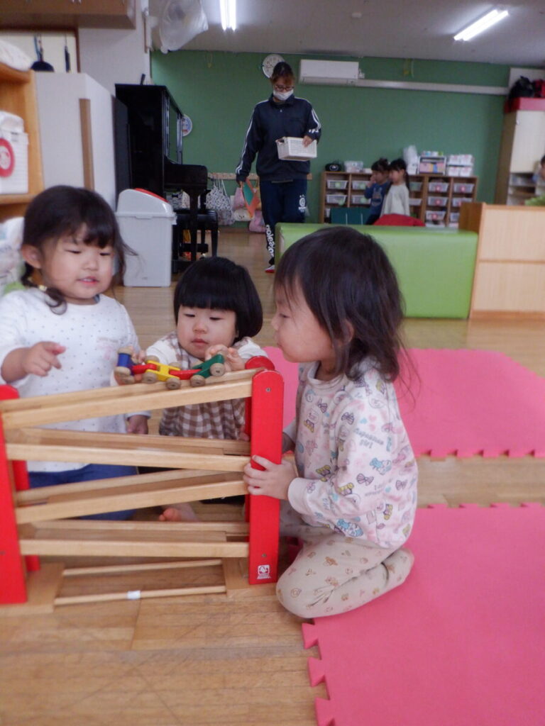 お部屋の中ではスロープトイでお友だちと順番こをして遊んでいます✨