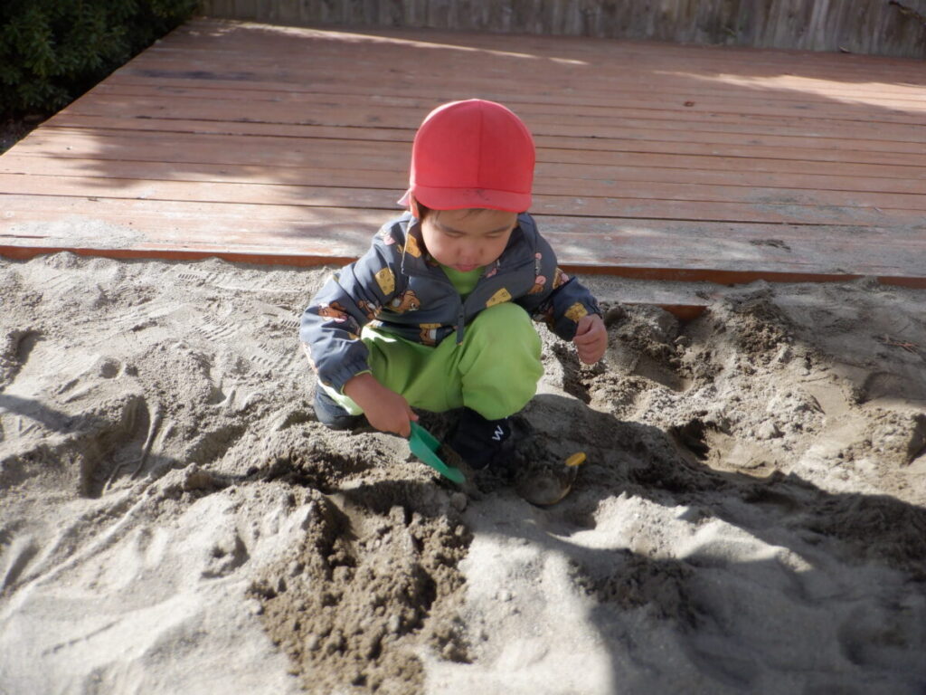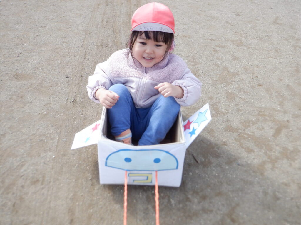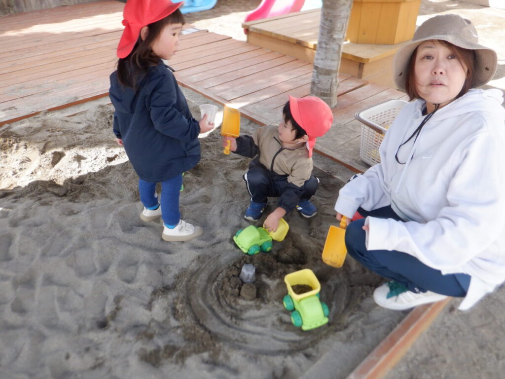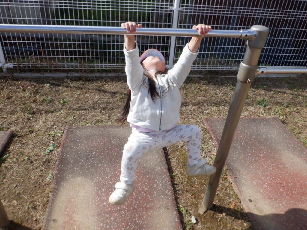鉄棒にぶらさがり「みてみて~」と見せに来る子や、砂場で車に砂を入れて運ぶ子もいます☺