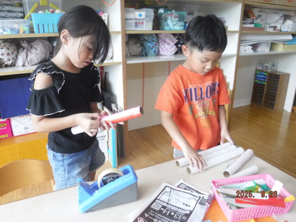 お部屋では、廃材などを使って想像を膨らませながら