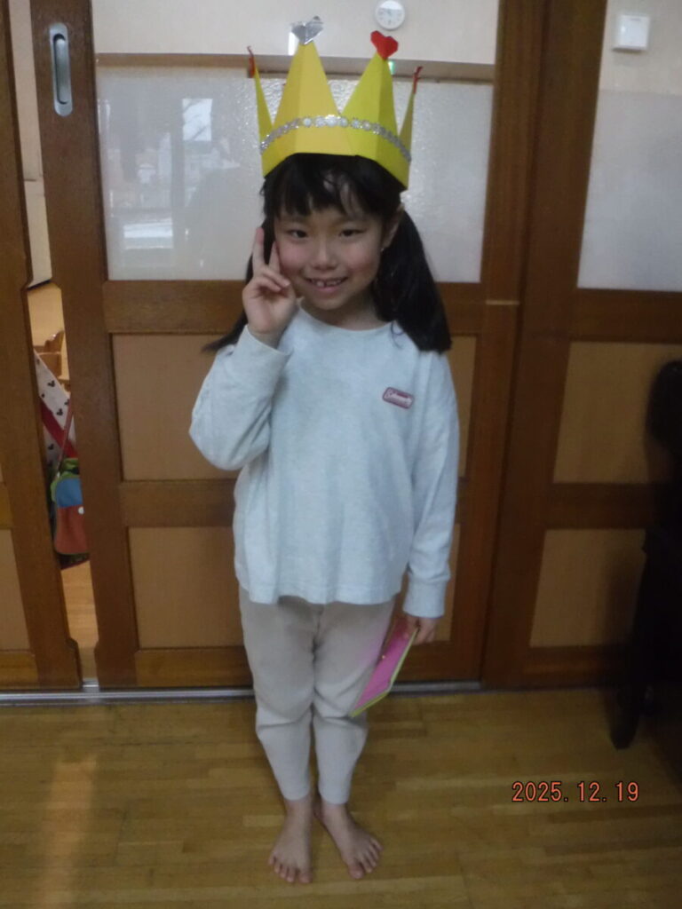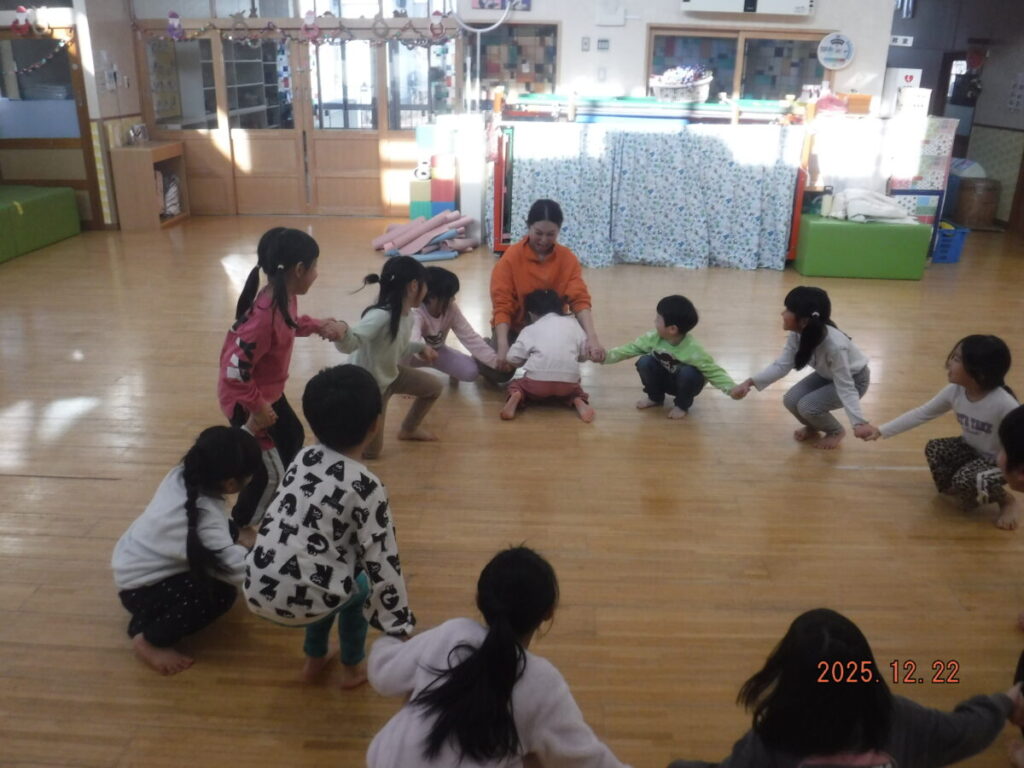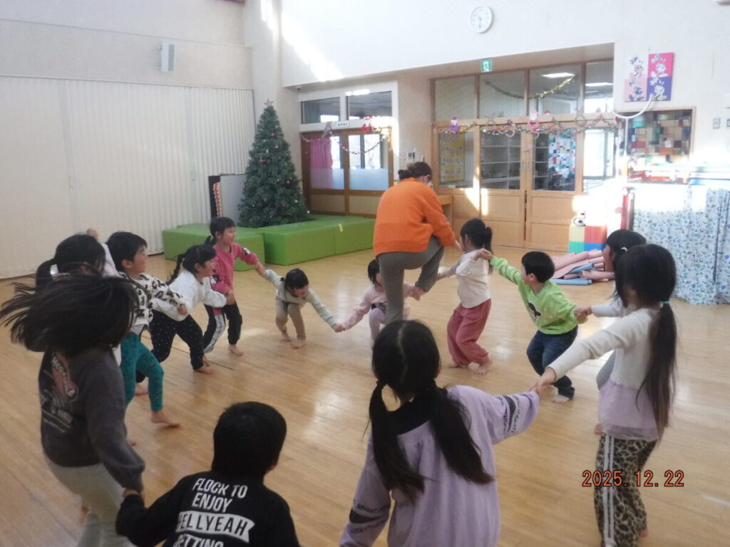 トナカイゲーム。そりと🎅サンタクロースの競争をしました。楽しんで体を動かしていました。