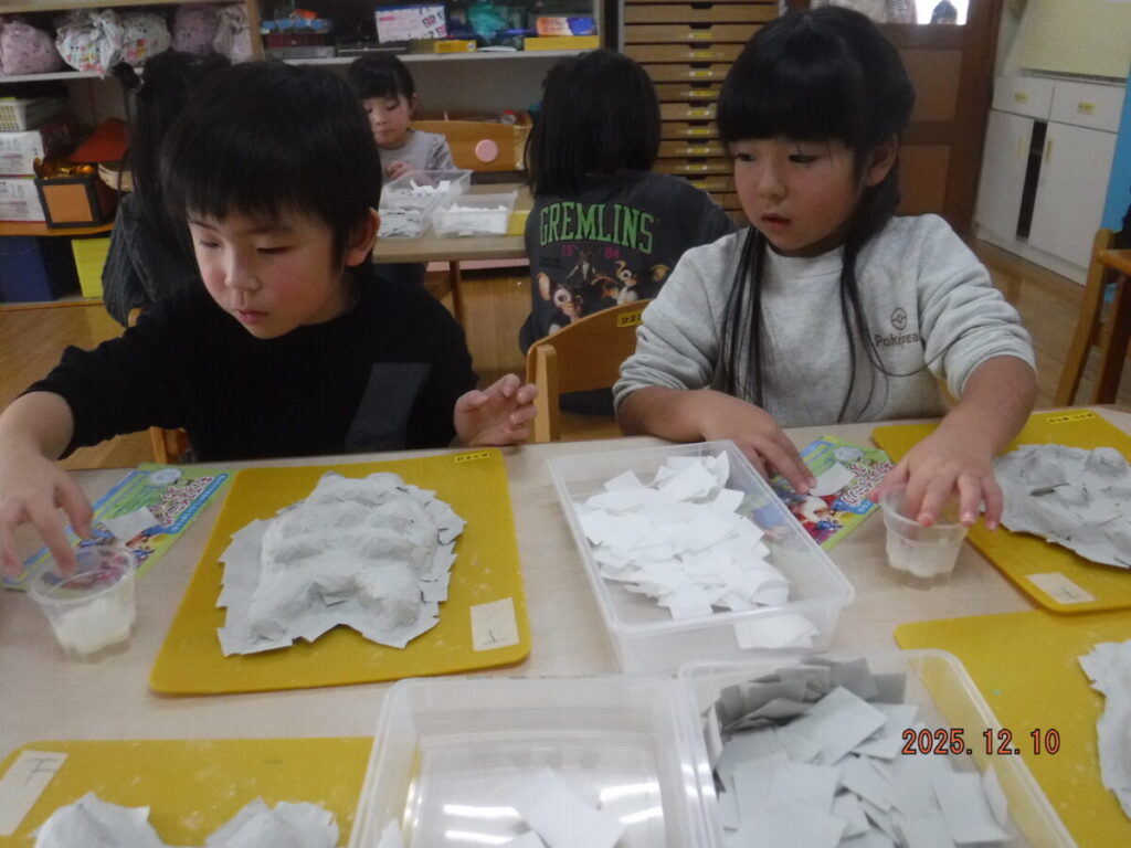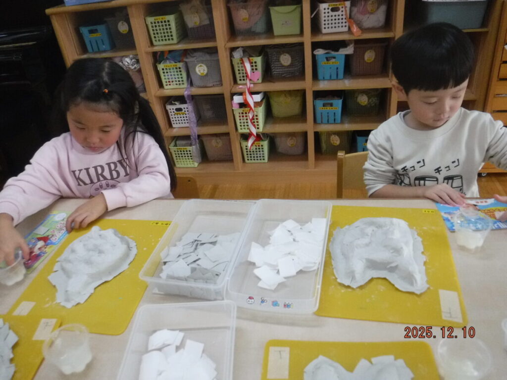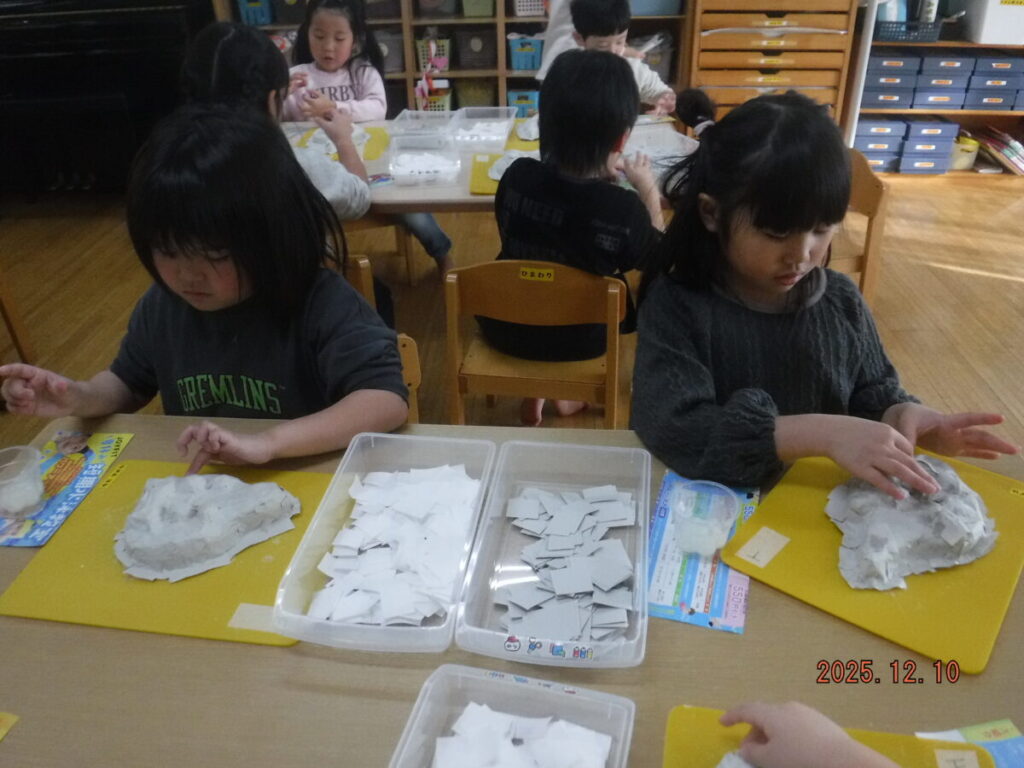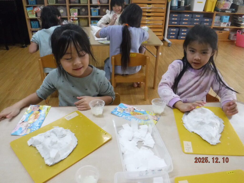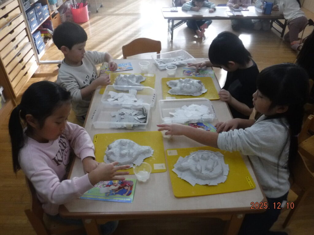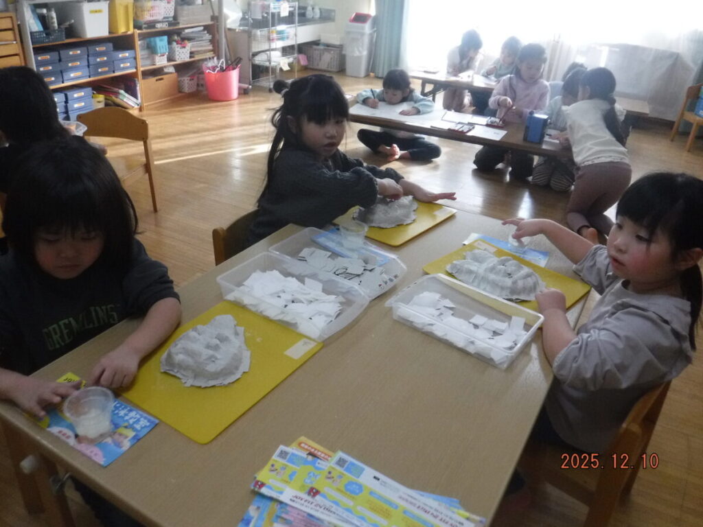 鬼のお面作り 毎日 1回・2回貼り続けて頑張っているひまわりさん🌻です。