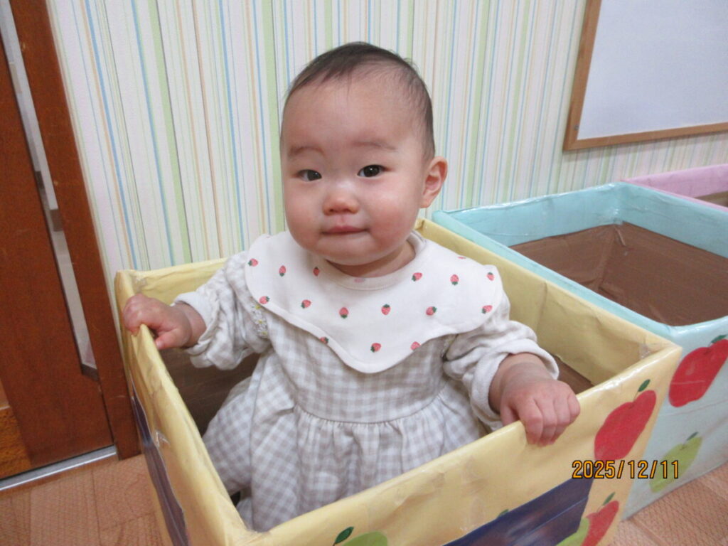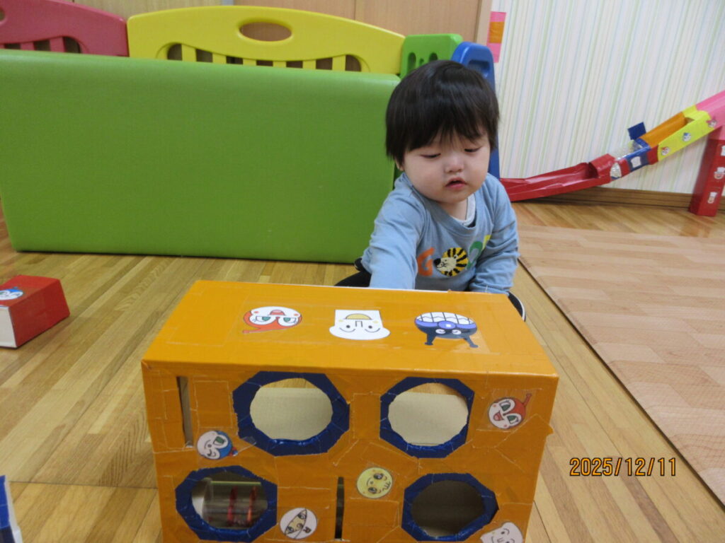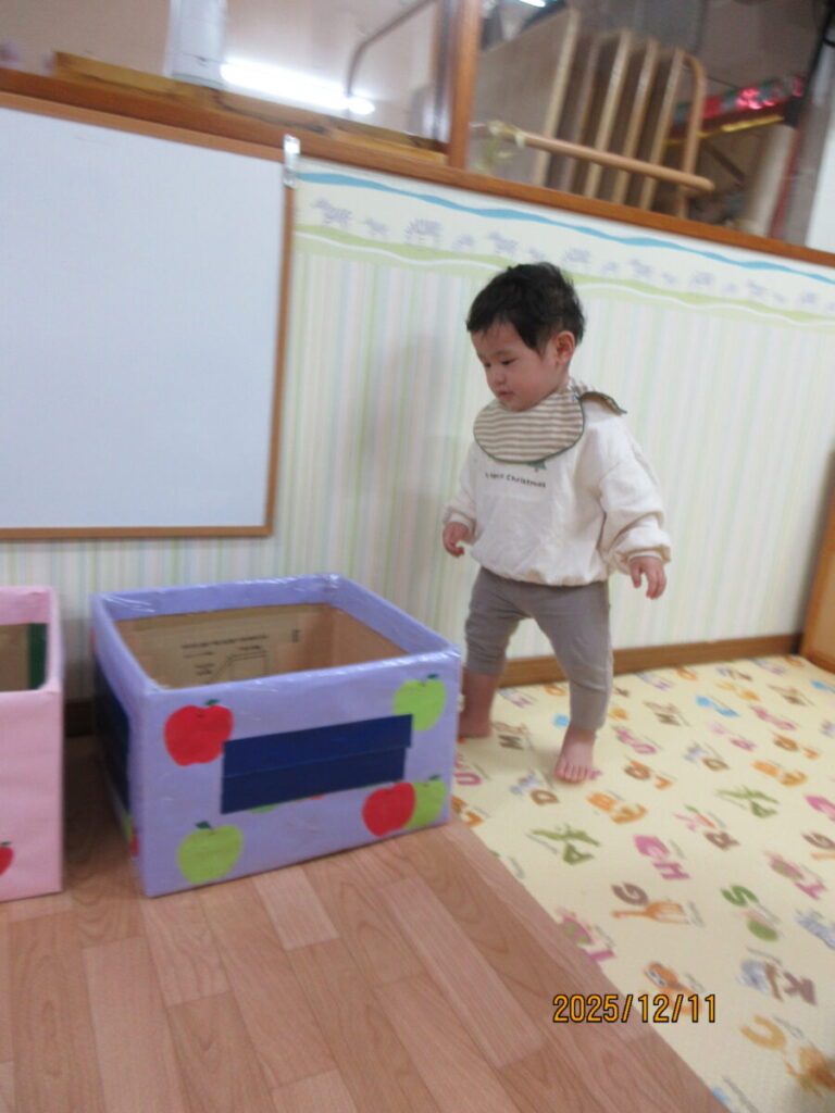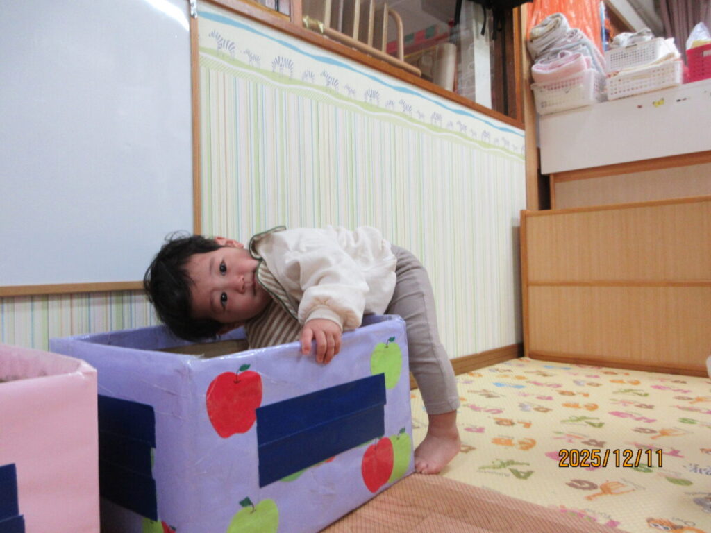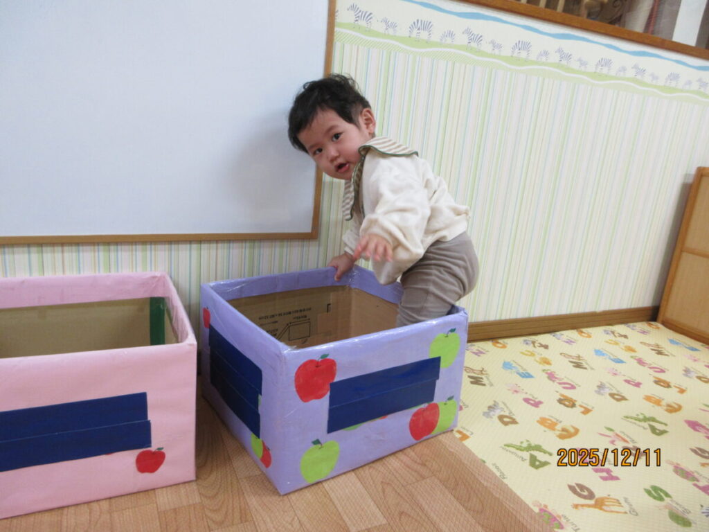 お部屋では箱に入って遊ぶのが楽しいようで、出たり入ったりしています。