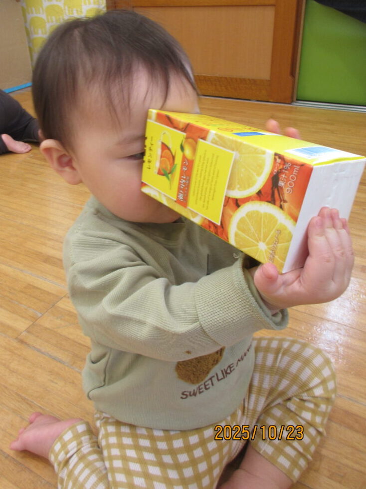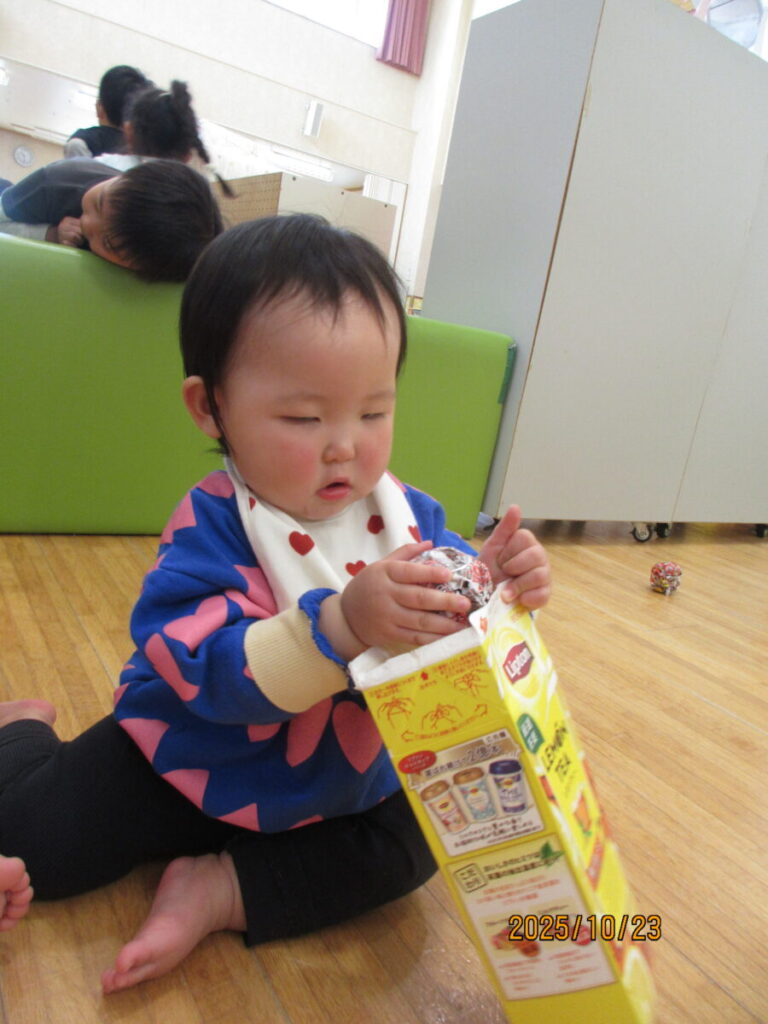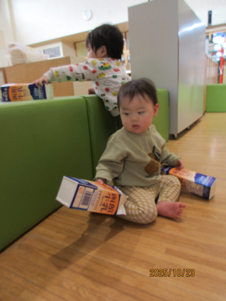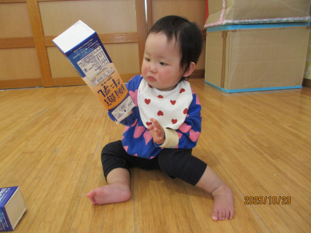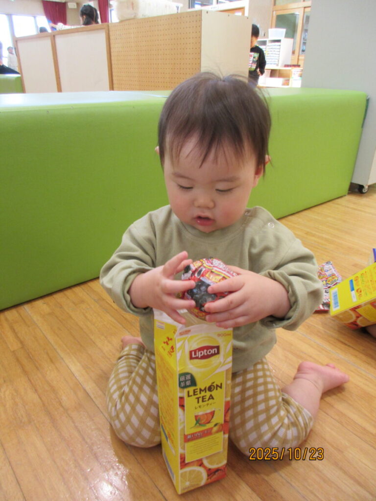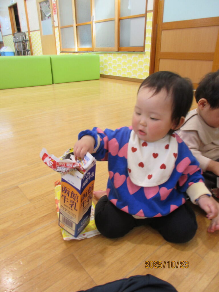 中を覗いたり、保育士の真似をしてパックの中にチラシをつめようとしてます。