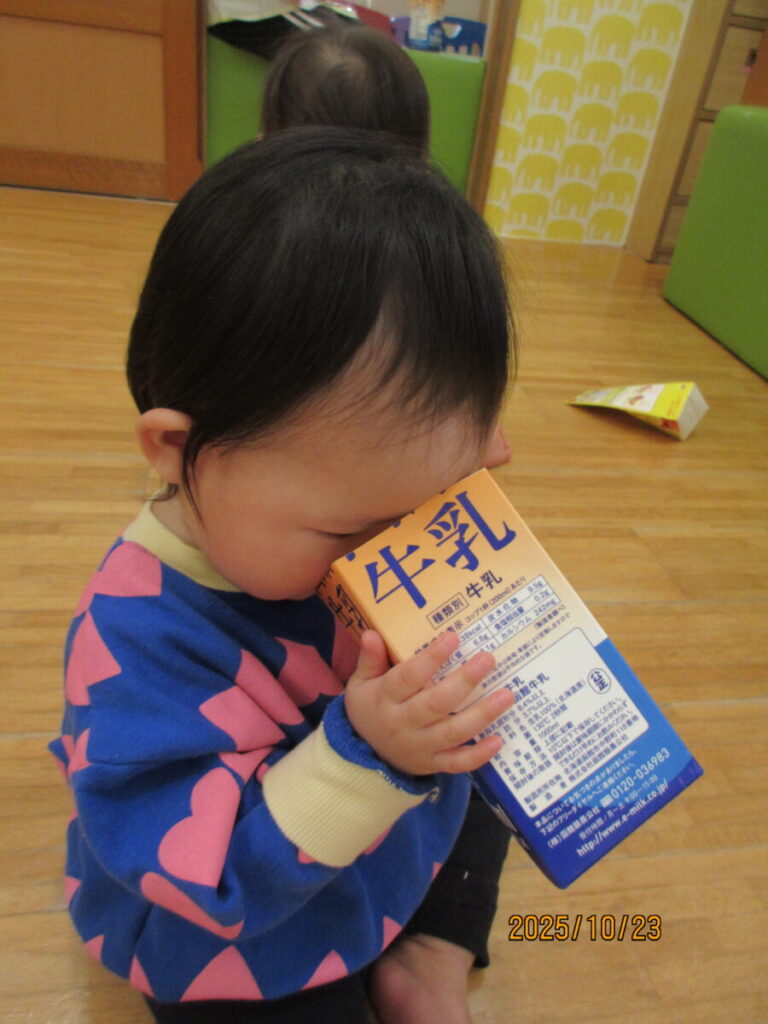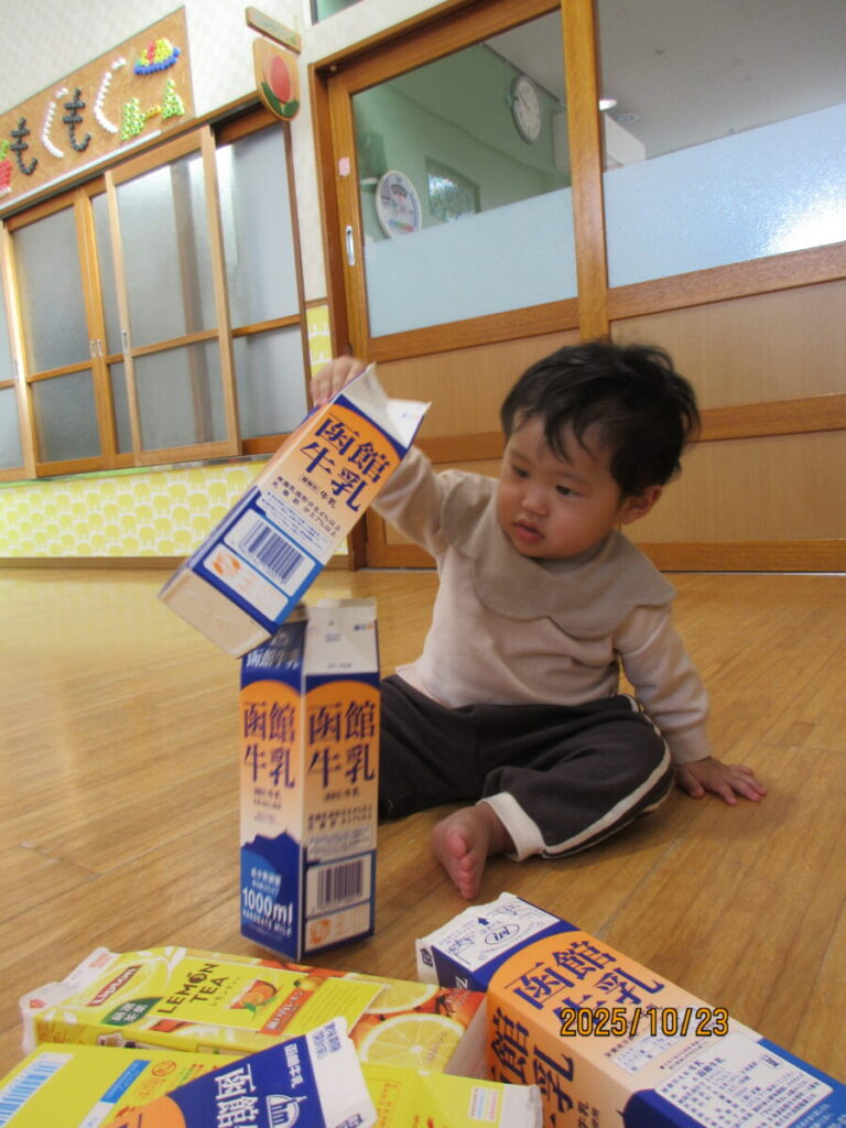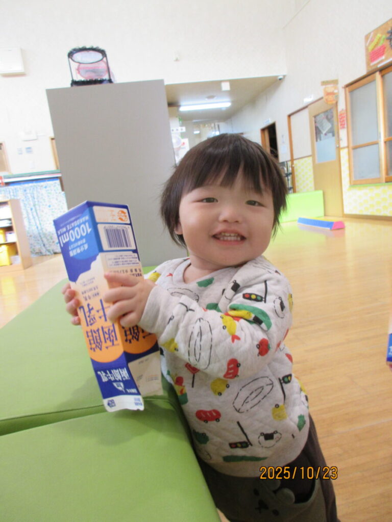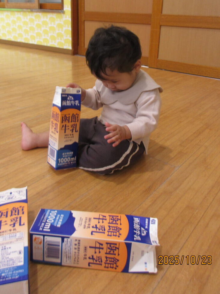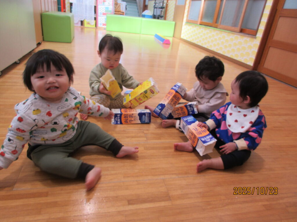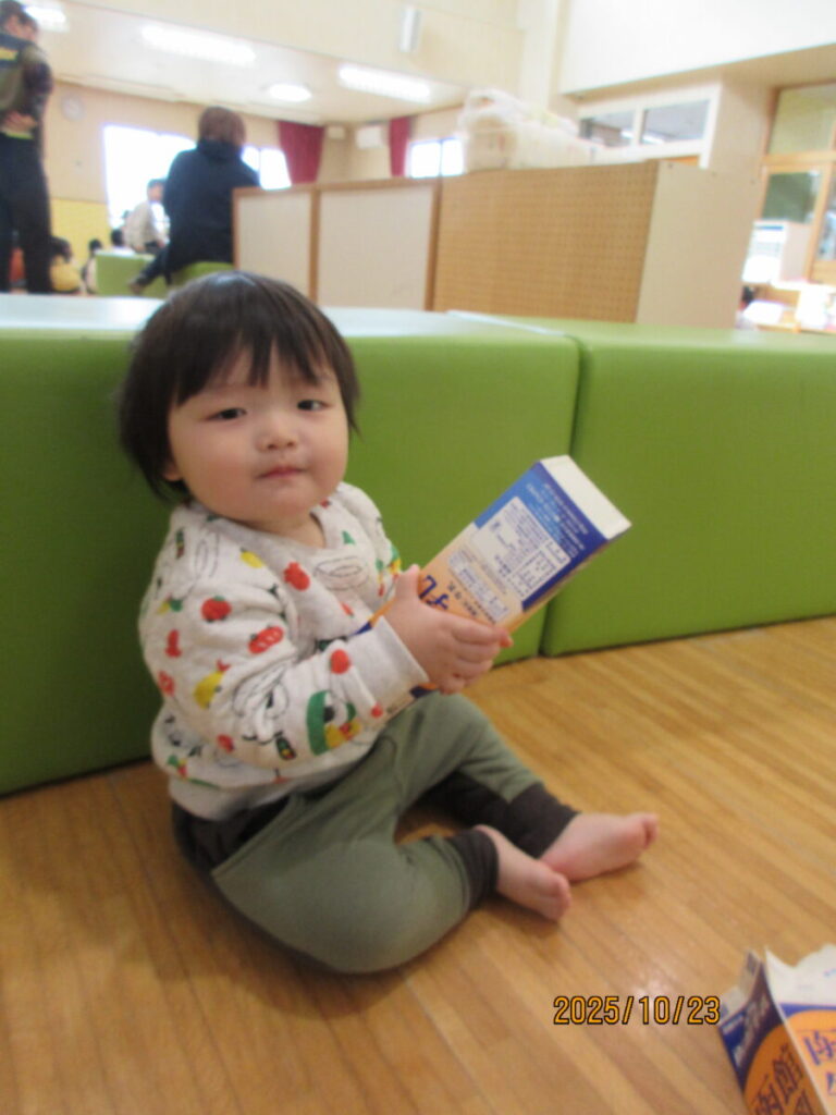 中を覗いたり、保育士の真似をしてパックの中にチラシをつめようとしてます。