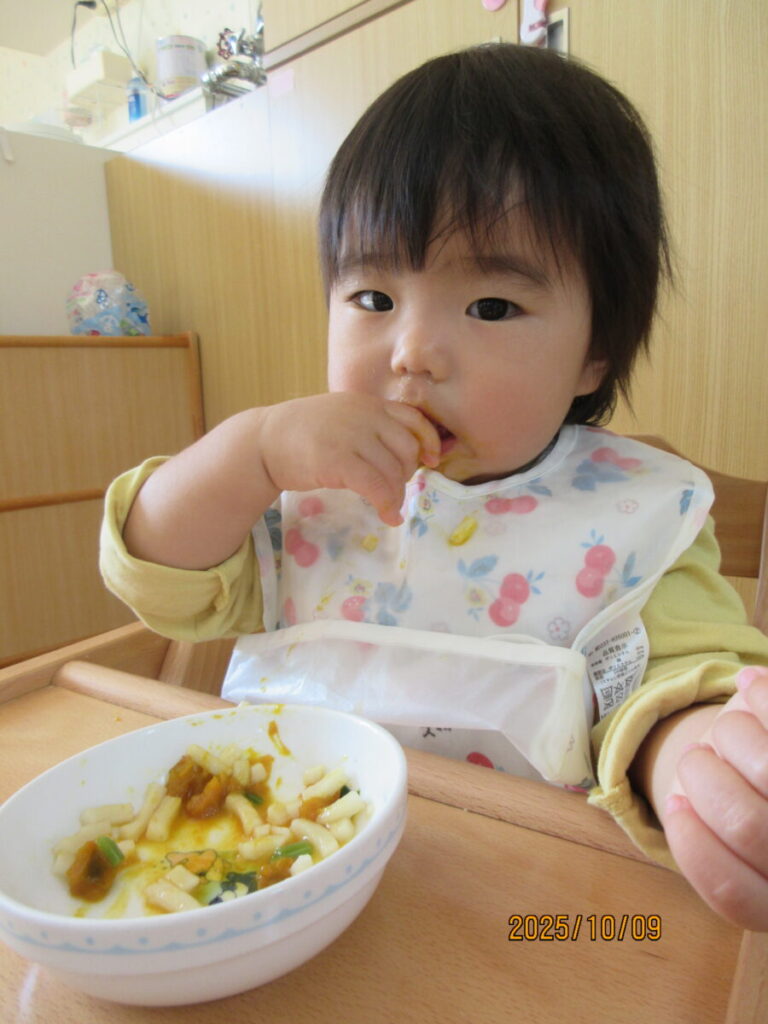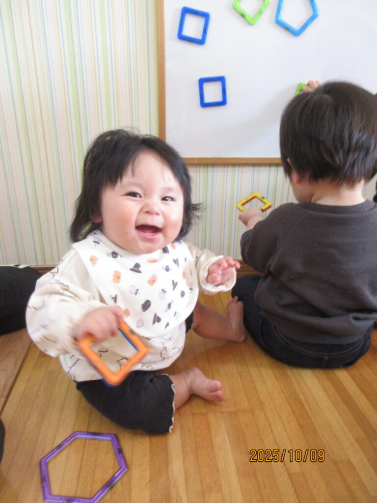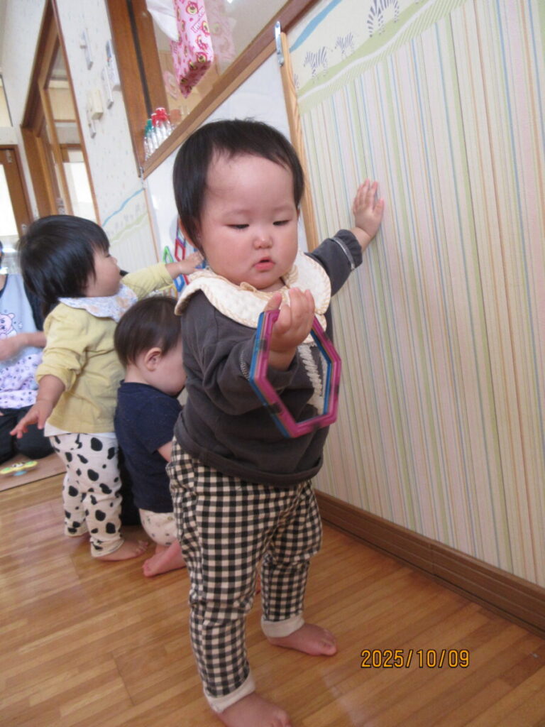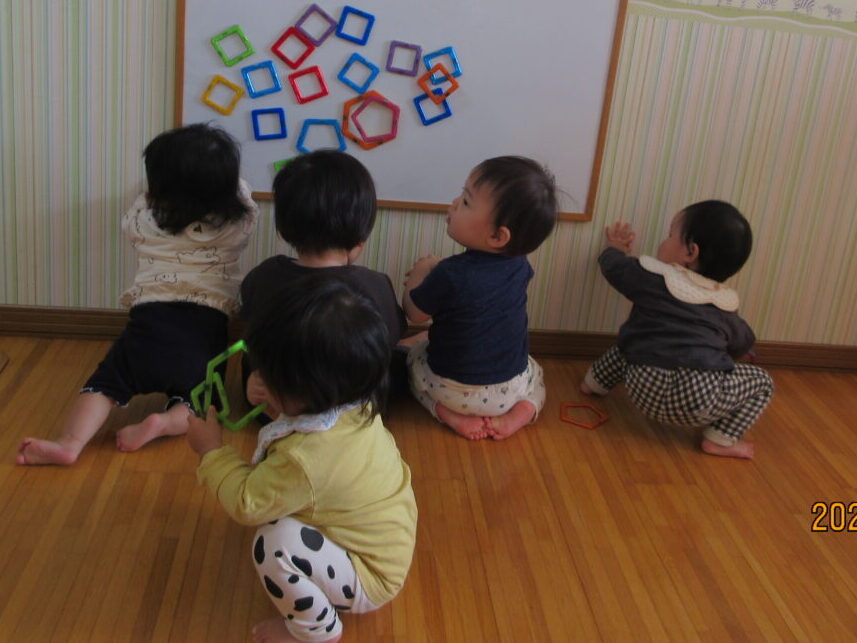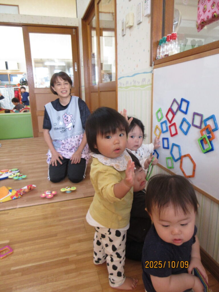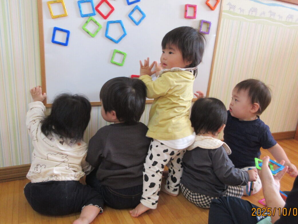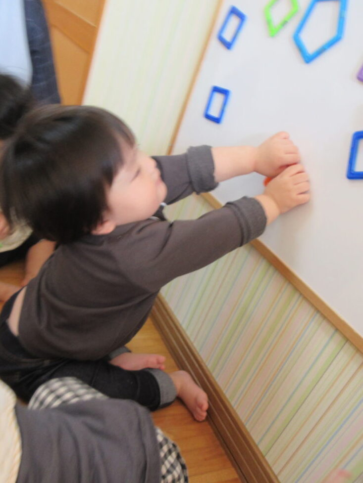 お部屋のボードにマグネットブロックをくっつけて遊んでいます。