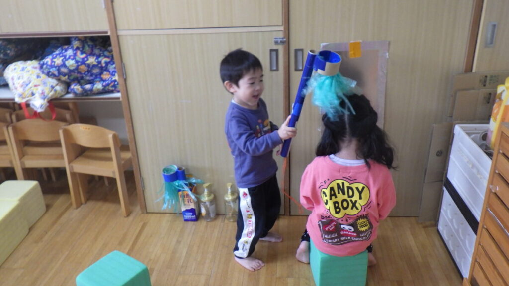 「大型積み木でやってみよう!」ということで、みんなで協力して積み木を運び、大きなお風呂ができました♨お風呂といえば・・・と、シャワーも協力して作りました。