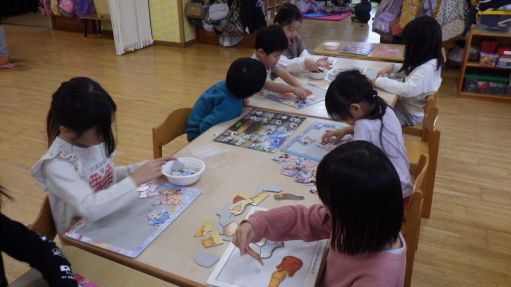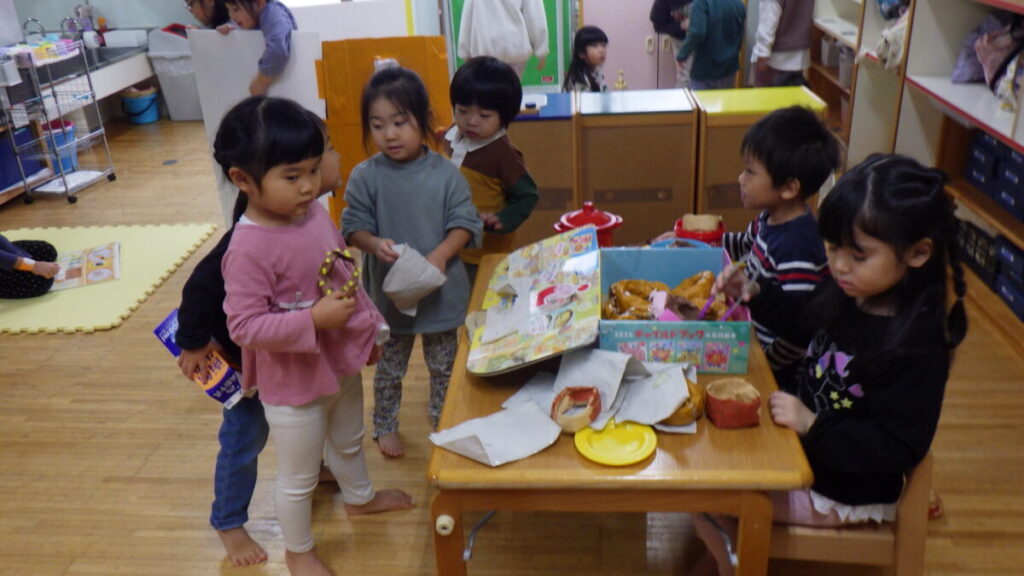 すみれぐみさんとたんぽぽぐみさんは、一緒にコーナー遊びを楽しんでいました。